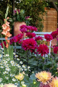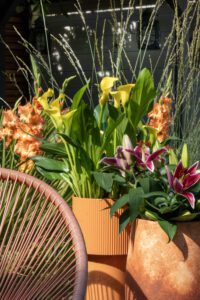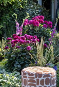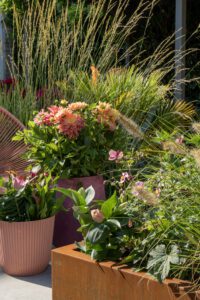 The ‘ Bold Blooms’ trend is all about gardens that exude warmth and coziness. Think rich, bright colors, soft textures, and a mix of materials that beautifully complement each other. In the garden, this is reflected in soft, round shapes, comfortable furniture, and borders full of lush plants and flowers.