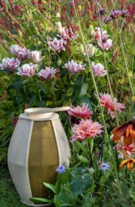 The colors are mainly pastels interspersed with a few bright accents. The shapes are often nostalgic and traditional, such as old dishes, bowls, or jugs. Garden furniture also often has a vintage look.