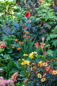 - Crocosmia (Montbretia) is also a great choice for partial shade. Its fiery red, orange, or yellow flowers attract butterflies and add vibrant color among other plants such as ferns