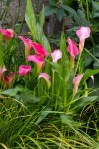 in borders, pots, or hanging baskets and bring instant cheer to even the most sheltered spots. - Calla lilies (Zantedeschia) also do well in the shade. Their elegant calyx-shaped flowers and glossy leaves bring a modern look to the garden or balcony. Plant them in a large pot or combine them with perennials for an interesting contrast.